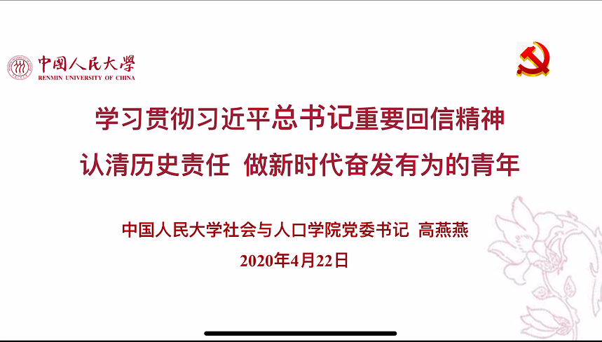 2020-04-24 文:黑猫tv 图:黑猫tv2020年4月22日下午,社会与人口学院第21期院党校入党积极分子培训班第一次线上党课培训成功举办。本次线上党课由社会与人口学院党委书记高燕燕主讲,社会与人口学院党委副书记唐颖主持,学院全体入党积极分子参加了本次线上学习。