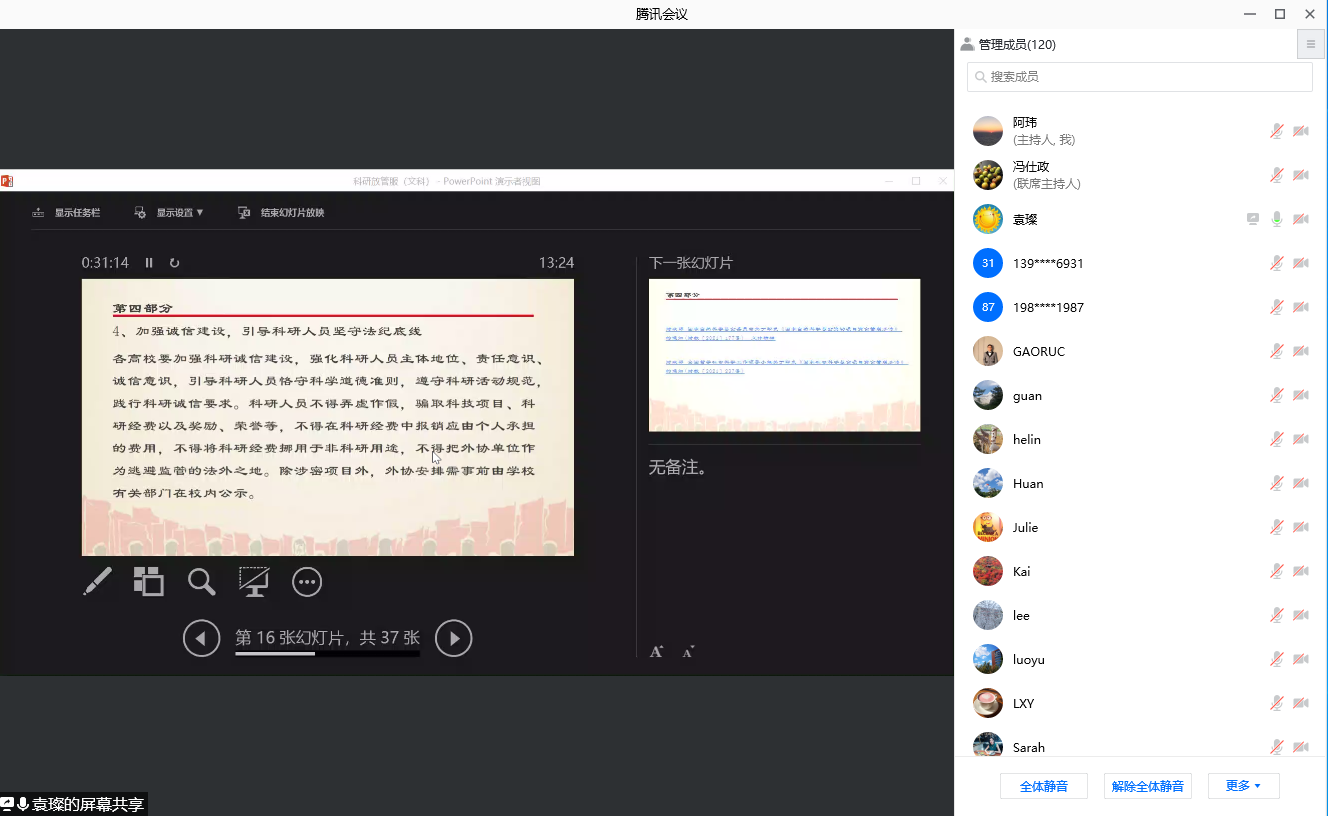 袁璨详细解读了近年来国家科研管理相关政策文件精神,重点解读介绍了《关于进一步完善重要财政科研项目资金管理等政策的若干意见(中办发〔2016〕50号)》《国务院办公厅关于改革完善中央财政科研经费管理的若干意见(国办发〔2021〕32号)》等上级文件及我校最新科研经费管理文件的主要内容,就“预算制”和“包干制”等新型科研经费管理模式的内涵和具体要求进行了说明,梳理归纳科研经费使用的监督管理要求和科研项目资金管理使用“负面清单”。