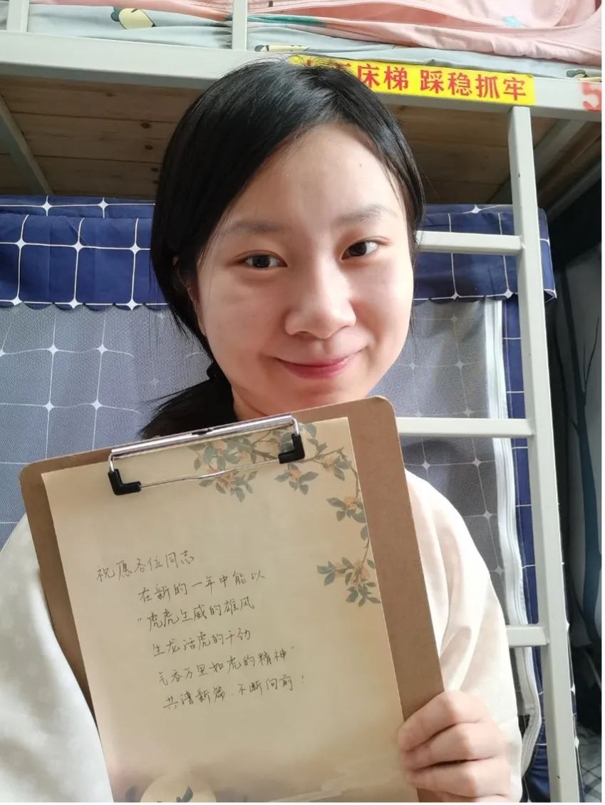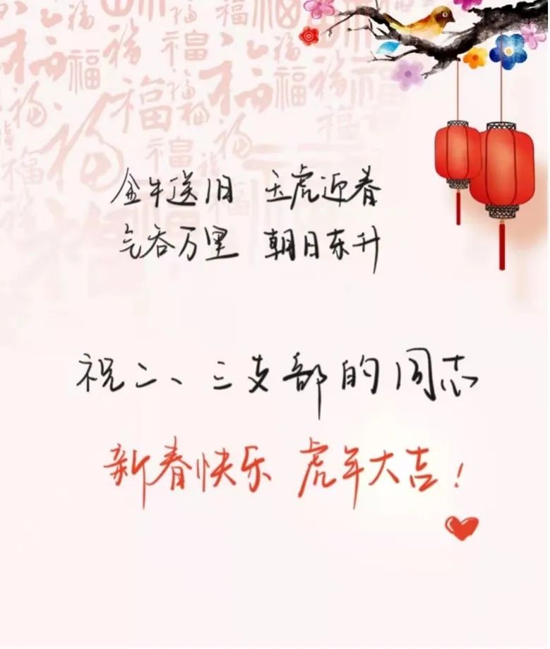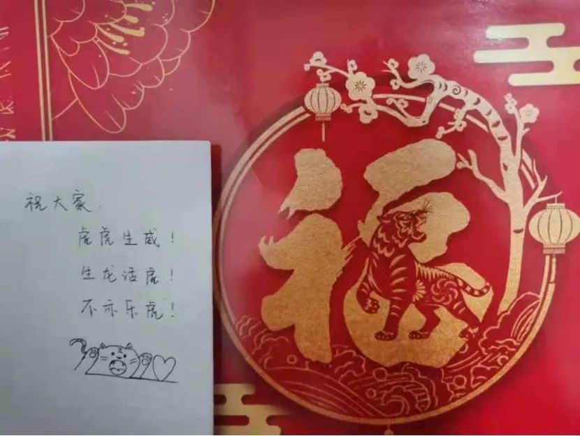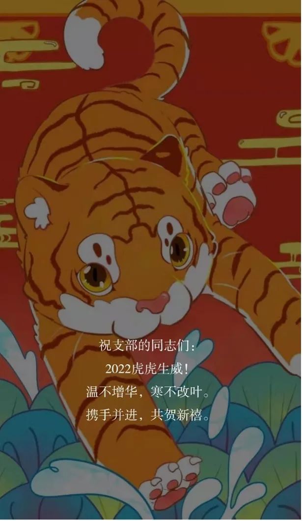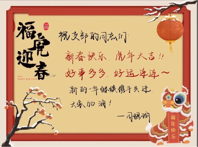支部党员们手写新春祝福,以照片或视频的形式献上新春祝福。三支部的刘芷桐同志的新年祝福语这样写道“愿我们早日战胜新冠、平安健康、顺遂幸福地度过虎年!”,三支部的晏雨琦同志祝福大家:“大家新年好呀!祝大家新的一年平安健康,万事胜意,天天开心!”二支部的管晓方同志写道“希望同志们在新的一年能以虎虎生威的雄风、生龙活虎的干劲、气吞万里如虎的精神共谱新篇,不断向前!”。