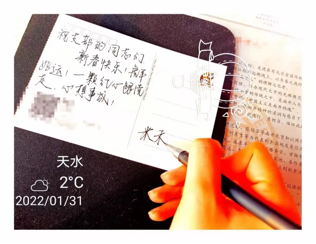 2022-01-01 文:黑猫tv 图:黑猫tv2022年1月,为迎接农历虎年,共同感受浓厚的传统文化气息和温暖的组织生活氛围,社会与人口学院本科博士第二联合党支部联合本科博士第三联合党支部开展“喜迎新春送祝福”主题党日活动,两个支部的同志互写祝福,共话未来。活动旨在传播中国民俗文化、传递新春幸福感,在祝福的传递中收获感动,开启新春梦想和希望。
