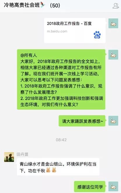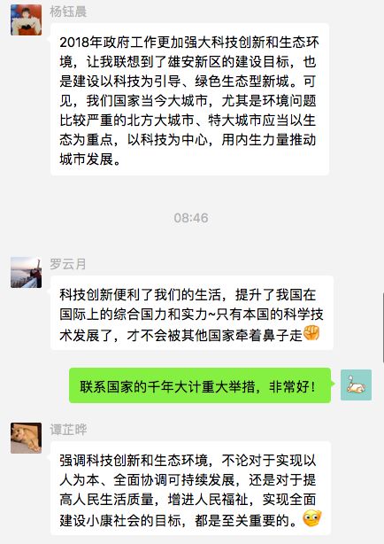 田丹盟同学从环境对人民生活“功在千秋”的属性表达了对政府强调生态工作的赞同;杨钰晨联系雄安新区的建设目标,思考大城市的环境问题的结构性调整出路;罗云月谈到了科技创新对生活的便利提高的作用,以及联系中兴事件思考对提高国家地位的作用;谭芷晔提到了科技创新和生态环境都是为了增加人民福祉,体现了政府工作的宗旨;王元超则从大学生角度,思考大学生可以为政府工作的支持做一些什么。最后,班长对他们的观点做了回应和肯定,各位同学都从不同角度切入,显示了本班同学学习和思考的积极和认真。本次线上学习活动也圆满结束。