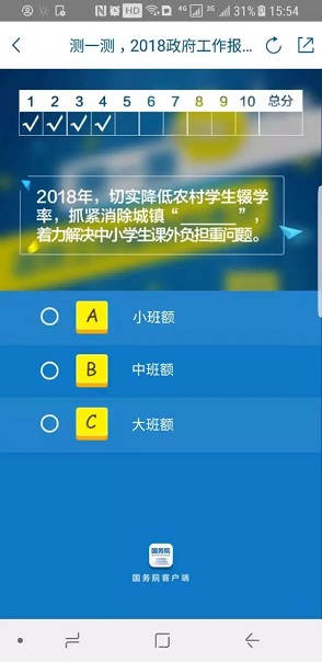 该班于5月20日晚九点在教二2409召开了“学习2018政府工作报告”主题班会,并开展了线上答题活动。首先由班长谢家彬同学进行PPT宣讲,解读2018政府工作报告。同学们在认真记录主要信息,以确保PPT宣讲之后的线上答题活动能答得又快又准。接着同学们参与了“测一测,政府报告知多少”国务院APP线上答题,最后有一半以上同学十题全对,获得300M流量。