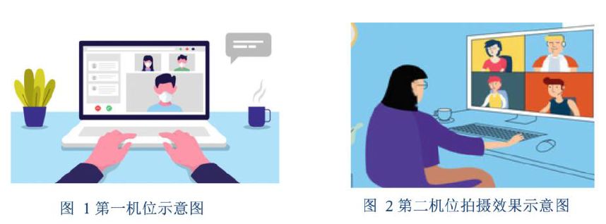 考生需要准备可以支撑“双机位”运行的硬件,即需要两部带摄像头的设备及附件,包括笔记本电脑、手机、手机支架等。一台设备(第一机位)从正面拍摄,放置在距离本人40cm处,另一台设备(第二机位)从考生侧后方45°距离本人右肩头40cm处拍摄,确保第一机位须可看到考生本人手部、头肩部及桌面,第二机位须可看到考生第一机位屏幕、考生面前桌面及手部动作。效果图如下: