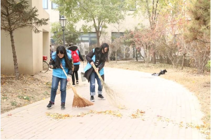 寒冷的天气并没有降低同学们参与志愿服务的热情,大家都积极认真地工作。尽管同学们之前都没有清扫落叶的经验,但大家还是很快掌握了清扫的诀窍。通过小组队员的分工配合,有的同学用扫帚归拢四处飘散的落叶,有的同学将归拢后的落叶扫入簸箕、装入垃圾袋。大家不仅非常专注地完成自己的工作,组员之间的配合也十分默契,完成任务较快的小组还主动帮助其他小组清扫。最终,大家在半个小时之内完成了整个小区的清扫工作。