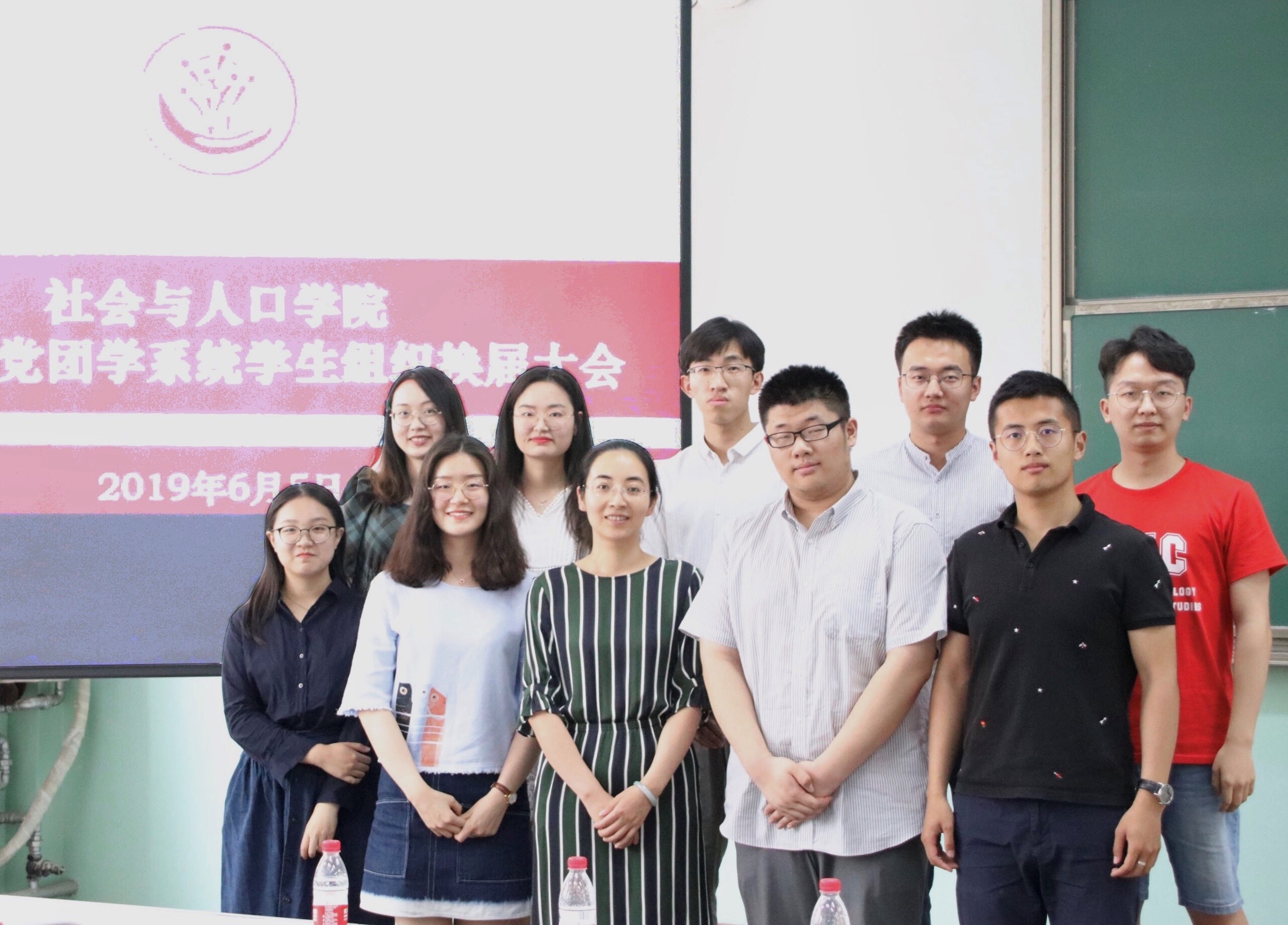 最后,唐颖老师、庄溪瑞老师、李桢老师与第十六届、第十七届常委合影留念。社会与人口学院第十七届党团学系统换届大会至此圆满结束。