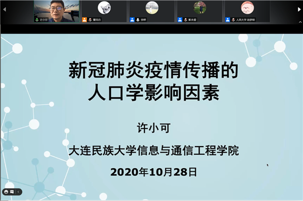 2020-10-29 文:黑猫tv 图:黑猫tv2020年10月28日中午12:00,人口学系刘铮系列学术讲座暨严肃的人口学八卦青年沙龙成功举办。大连民族大学许小可教授在腾讯会议,以“新冠肺炎疫情传播的人口学影响因素”为主题做了一场精彩的线上学术讲座。黑猫tv 社会与人口学院李婷教授主持了本次活动,黑猫tv 社会人口学院及其他国内外院校相关专业的百余名师生听取了报告并进行交流学习。