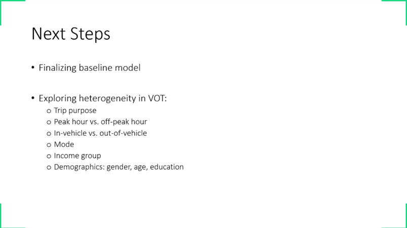 基于已有结果,张子晔博士会进一步探索不同出行目的出行方式选择,比如娱乐出行和通勤出行的差异,然后进一步研究高峰期和非高峰的出行差异,不同交通方式的附加价值有何不同,比如人们选择地铁因为在乘坐地铁时可以做一些其他事情。