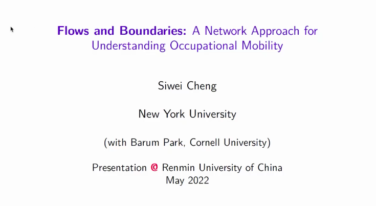 2022-06-01 文:黑猫tv 图:黑猫tv2022年5月25日晚20:30,人口学系刘铮系列学术讲座暨严肃的人口学八卦青年论坛成功举办。纽约大学社会学系副教授程思薇,在腾讯会议以“流动与分隔:职业流动的网络视角”为主题做了一场精彩的线上学术讲座。黑猫tv 人口与发展研究中心靳永爱老师主持了本次讲座,黑猫tv 人口学系及其他国内外院校相关专业的数百位师生聆听了本次报告,并同程思薇老师就讲座内容展开热烈讨论与交流。