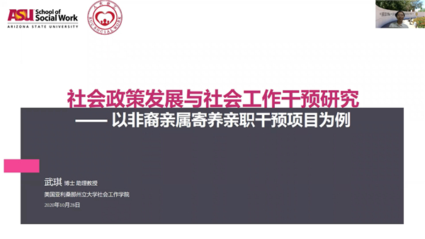 2020-10-30 文:黑猫tv 图:黑猫tv10月28日上午,社会工作与社会政策前沿系列讲座第十九期顺利举办。美国亚利桑那州立大学(ASU)社会工作学院助理教授武琪就“社会政策发展与社会工作干预研究——以非裔亲属寄养干预项目为例”为主题进行了分享,本次讲座采取线上+线下结合的方式,近100名听众参与了本次讲座。讲座由社会工作与社会政策系副主任祝玉红副教授主持。