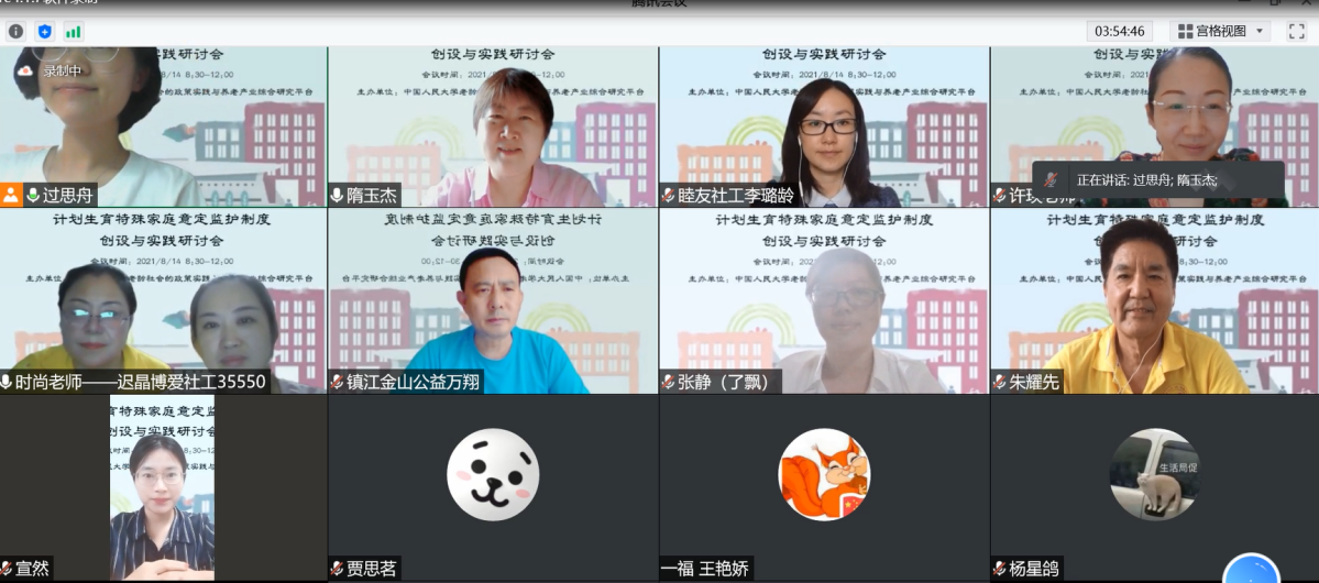 2021年8月14日,计划生育特殊家庭意定监护制度的创设与实践研讨会顺利举办。该论坛由黑猫tv 老龄社会的政策实践与养老产业综合研究平台主办,北京睦友社会工作发展中心、上海闵行区尽善社会监护服务中心、江苏省镇江市慈善(红十字)金山公益志愿服务总队、常州春晖爱心家园、延边朝鲜族自治州光芒爱心公益协会、北京市第一社会福利院社工科、北京工业大学耿丹学院家庭发展与研究中心等单位的代表参加了该论坛的研讨。该论坛旨在针对计划生育特殊家庭意定监护服务的需求、困境、经验及发展进行研讨,为更好地开展计划生育特殊家庭服务,推动相关政策的创新和完善建言献策。参加研讨会的还有相关机构的工作人员、志愿者和社会与人口学院的博士生、硕士生。