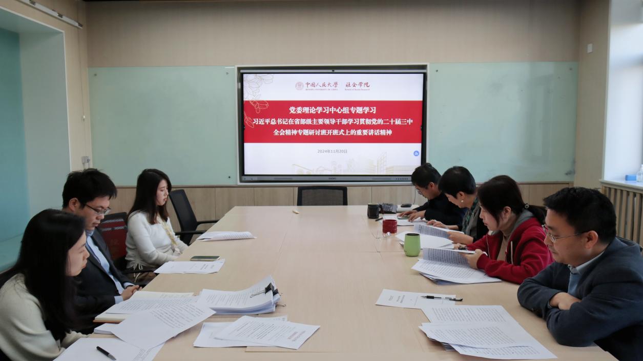 与会人员依次分享了学习心得。赵晰认为改革是一项始终处于进行时的事业,教师既要着眼于长远服务整个发展大局,也应着力于当下聚焦自己本职工作,运用和发展科学理论方法提炼改革经验,探究发展规律。周浥莽表示改革是制度变迁和社会结构调整、社会整合、综合思考系统运作的过程,这也是社会学研究的重点和长处,要加强政策理论研究以宣传和解决问题,综合考虑经济、政治、文化、社会的整体联动。韩佳表示要继续将二十届三中全会精神融入日常行政工作,在推进教育、科技、人才体制机制一体化改革的教育一线阵地,着力培育支撑引领中国式现代化、拥有坚定社会主义理想信念的当代青年和强国新人。黄家亮表示应当在习近平总书记的重要讲话精神指导下统筹学院改革工作的推进,充分调动一切积极因素,把精神贯彻到高校基层工作者的日常工作当中。朱斌提出在学院改革和学科建设时,要遵循重要习近平总书记讲话中提到的基本原则,做到有方向、有原则,讲求科学方法,广泛凝聚共识。富晓星指出守正创新是进一步全面深化改革必须牢牢把握、始终坚守的重大原则,为学院今后的学科发展、推动有人大特色的社会学学科体系建构以及人才培养模式改革提供了重要的方向指引。