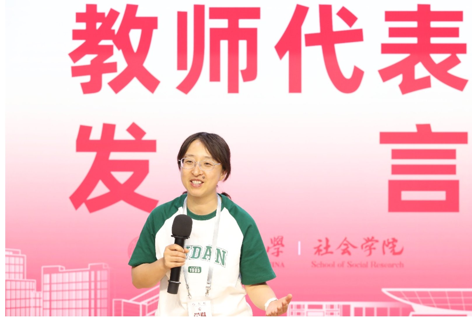 复旦大学社会发展与公共政策学院的吴菲老师作为本次参赛队伍的教师代表发言。吴菲老师借用“盆景”和“蔬菜架子”这两个生动的比喻,探讨了应如何从课堂教学、课外活动、评价体系等多个方面进行改革,以更好地激发学生的创造力和独特性。她表示,“强东杯”社会学知识竞赛不仅让她获得了和学生面对面的共事体验,还收获了一段鲜活的时光和宝贵的记忆。她对“强东杯”社会学知识竞赛提供的促进学术交流的平台表示感谢,希望参赛选手们无论输赢、纵情享受。