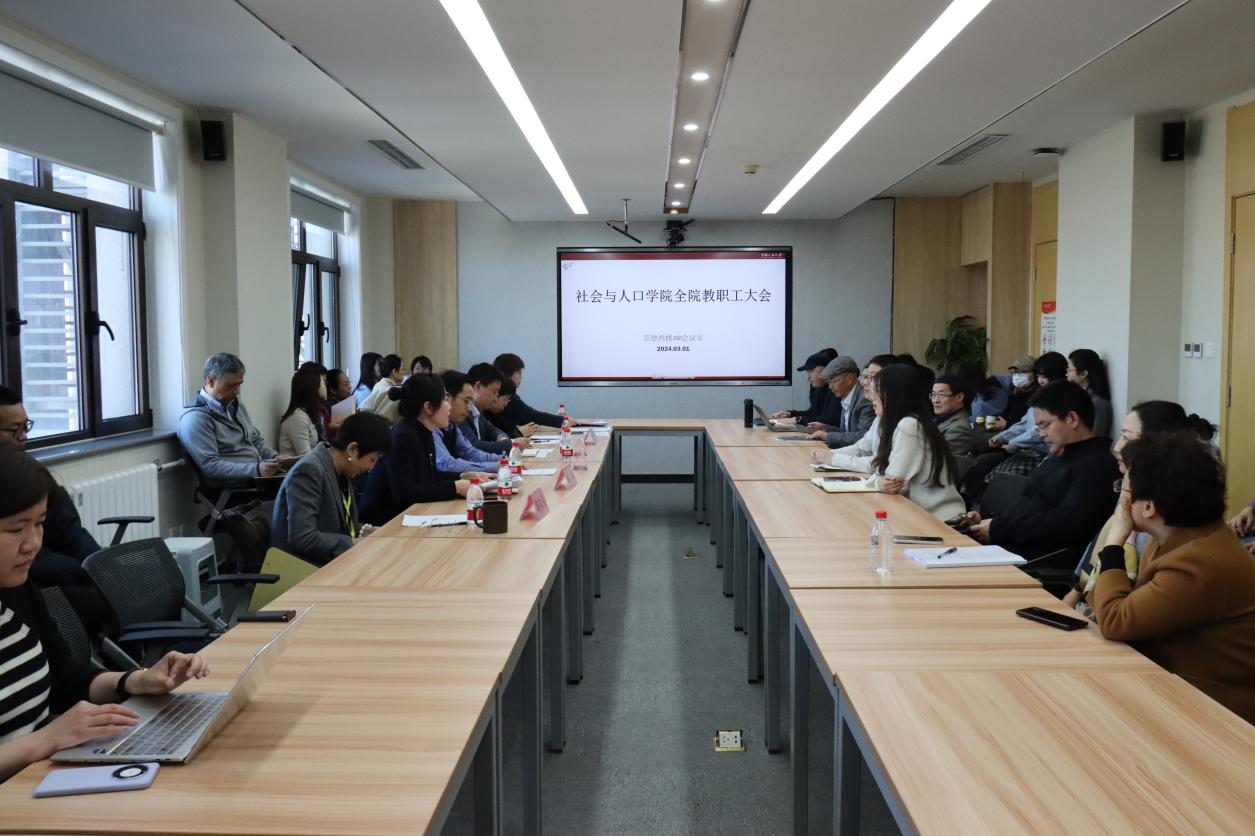 2024-03-03 文:黑猫tv 图:黑猫tv3月1日中午,社会与人口学院新学期全院教职工大会在崇德西楼512会议室召开。副校长、学院院长冯仕政,学院党委书记孙权,学院党委副书记、纪委书记黄家亮,学院副院长宋月萍、富晓星,全院教职工参加会议。会议由孙权主持。
