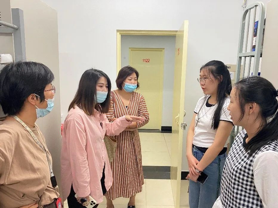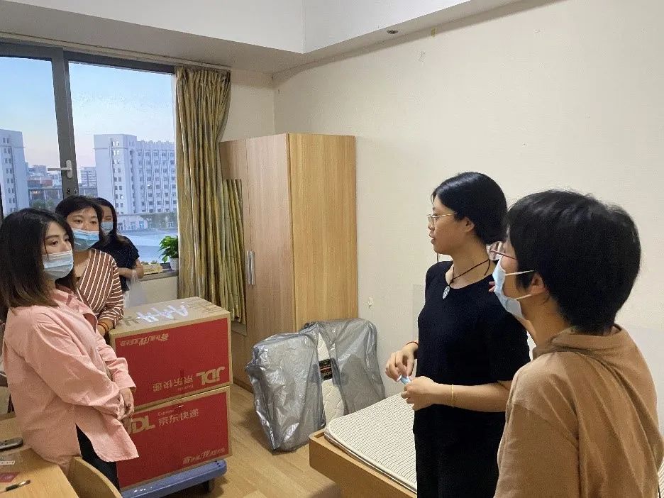 孙权书记和宋月萍副院长分别带领女老师们看望女生硕士及本科、博士新生。新生们对领导、老师的探访表示热烈欢迎。老师们亲切慰问了解新生基本情况,感受寝室条件,并鼓励同学们致力学习、更进一步。老师们也提醒同学们遵守学校防疫政策,按要求及时完成核酸检测,同学们也对老师们的关切表达了感谢。令人温暖的是,老师们帮助新生搬运行李,并和新生家长通过视频电话交流问候,其乐融融。
