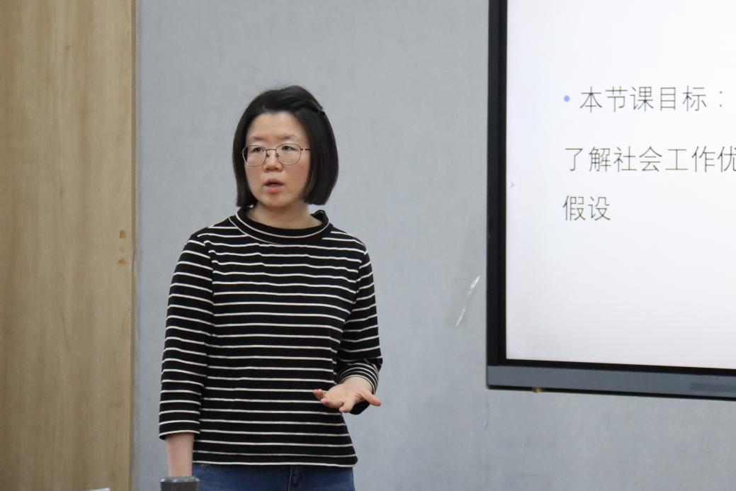 王子彧的讲授主题为“社会工作价值与干预:优势视角”。她由围绕核心概念、历史起源、基本假设、定义等方面深入浅出地讲授了优势视角的重要知识点,并用与其相对立的问题视角进行对照解读。在讲授过程中加入小组讨论环节,激发学生通过思维碰撞加深理解。课程的最后,回顾了本节课的内容并留下延伸问题启发思考。