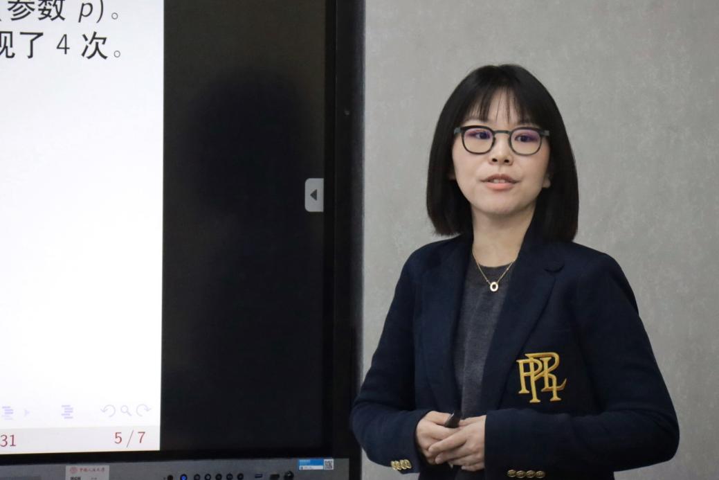 金嘉云的讲授主题为“极大似然估计”。她先引导学生在情景中考虑数据的分布情况,层层递进地梳理统计逻辑,介绍最大似然估计的应用场景,并引用《潜伏》的片段介绍极大似然估计的核心要义。接下来,她在不同类型的具体例子中讲授计算步骤。最后,她将“概率”和“似然”进行比较,启发学生加深对这一统计方法的理解。