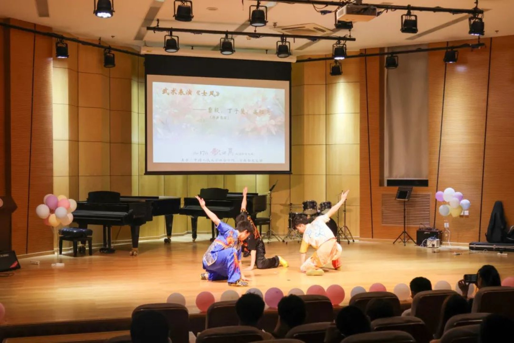 第一轮抽奖环节后,比赛特邀嘉宾曹毅、丁子斐、高任飞向大家展示了武术表演《士风》。月下独酌,竹林对弈,刀光剑影,纵横交错,取太极平淡冲和之意,借意醉心不醉的醉拳之形,表现了中华传统武术攻守技击的哲学之道。