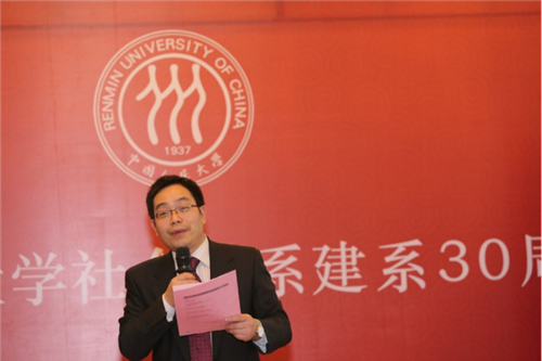 张建明代表学校致辞。他对从五湖四海返回母校参加建系三十周年的系友们表示欢迎。他回顾了人大社会学系从建系以来不断前进的光辉历史,指出正是老师们和同学们长期以来对社会学系的支持,才成就了社会学系现在的辉煌。他相信社会学系未来将会有更好的发展,欢迎系友们三十年后再回到母校见证人大社会学系的新成就。