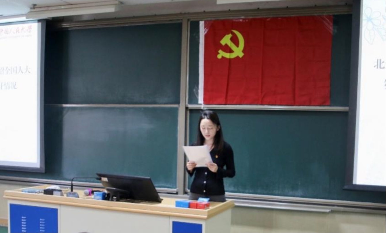 北京大学人口所社会工作专业硕士党支部那爽同志介绍了全国人大第十四届二次会议、全国政协第十四届二次会议的召开情况,并摘选两会期间习近平总书记在参加江苏代表团审议时的重要讲话、在看望参加政协会议的民革科技界环境资源界委员时的重要讲话以及李强总理代表国务院所作的政府工作报告的主要精神与大家一起回顾学习。